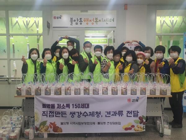 김해시 불암동지역사회보장협의체(공공위원장 허치권, 민간위원장 성태숙)와 불암동건강위원회(위원장 김말선)는 9일부터 저소득층 어르신 150세대에 직접 만든 생강청과 견과류를 전달한다고 밝혔다.