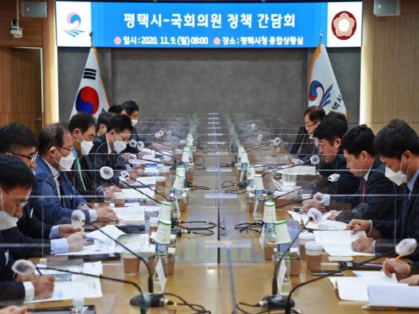 평택시는 9일 시청 종합상황실에서 지역 국회의원과 정책간담회를 개최하고 2021년도 국비확보와 현안 해결을 위한 초당적 협력을 다짐했다.