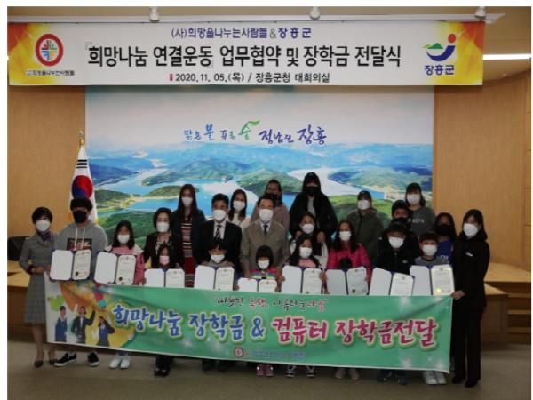 협약 체결에 따라 희망을나누는사람들은 장흥군으로부터 장학생을 추천받아 10명의 학생들에게 연 60만원의 장학금과 매년 2명에게 100만원상당의 컴퓨터를 지원하고 2억원 상당의 생활용품을 지원하기로 했다.