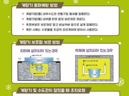 또한, 시는 계량기 동파예방을 위해 지역별 동파 취약 수용 가구를 사전에 조사하여 노후 된 계량기 보호통 덮개 및 보온재를 교체하고 수도관 및 수도계량기 동파 시 신속한 교체로 주민불편을 최소화하기 위해 지역을 5권역으로 구분 생활민원업체를 24시간 운영할 계획이다.