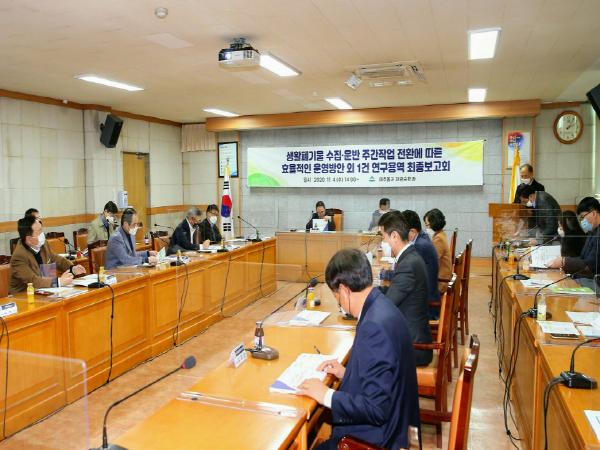 지난 5월 착수해 5개월 간 진행된 이번 연구용역은 생활폐기물 수집운반 관련 안전기준 마련에 따라 수집운반 작업을 주간작업 전환에 따른 적정 인력 및 장비 등에 대한 원가계산을 실시했다.