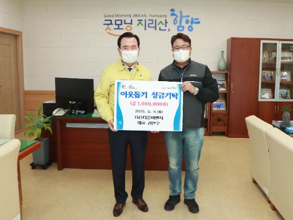 함양군은 9일 (유)다온이엔지 김인수 대표는 “코로나19로 어려움을 겪는 이웃들에게 전해 달라”며 함양군에 100만원을 기부했다고 밝혔다.