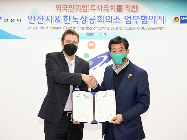 안산시가 전국 기초지방자치단체로는 최초로 한독상공회의소(KGCCI)와 상생협력·발전 업무 협약을 체결하고 외국인기업 투자 유치를 위한 본격적인 발판을 마련했다.