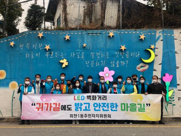 양주시 회천1동 주민자치위원회는 올해 주민자치 특화사업인 ‘귀갓길에도 밝고 안전한 마을길’의 일환으로 덕정중학교 옆의 마을 담장에 LED 벽화사업을 실시했다고 밝혔다.