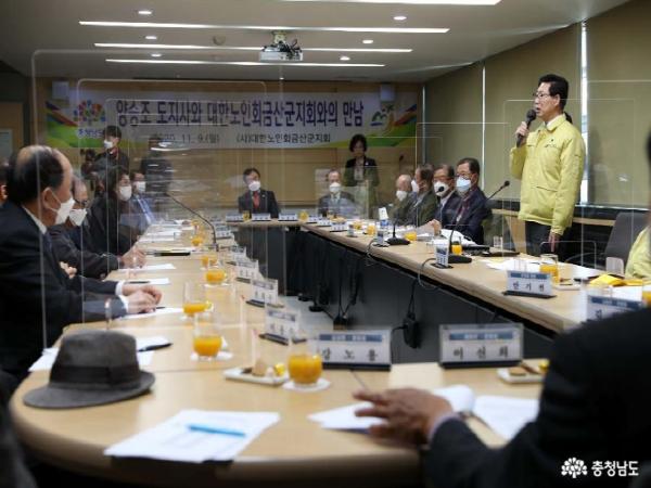 양 지사는 먼저 지난해 노인재능나눔활동 우수지회로 선정되는 등 모범적인 운영에 앞장서고 있는 대한노인회 금산군지회를 들러 노인회 운영 현황을 듣고, 관련 정책에 대한 의견을 수렴했다.