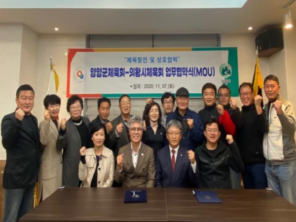 의왕시체육회는 양양군체육회와 양 임직원이 모인 가운데 지난 7일 ‘체육발전과 상호협력을 위한 업무협약(MOU)’을 체결했다고 밝혔다.