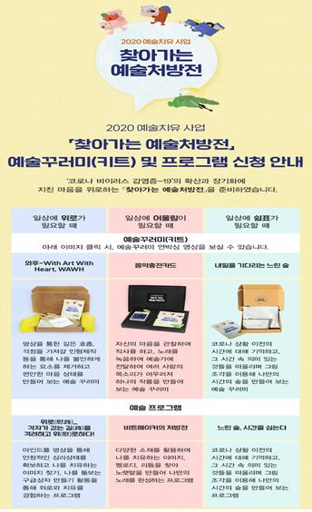 ‘찾아가는 예술처방전’의 일정, 신청방법 등 더욱 자세한 내용은 교육진흥원 공식 누리집(www.arte.or.kr)에서 확인할 수 있다.