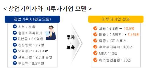 실태조사를 통해 파악한 결과, 창업기획자로부터 투자받은 기업 1,655개사는 투자 이후 총 7,013명의 신규 일자리를 창출(10,405명 → 17,418명)했고, 투자 전·후 업체당 평균 고용과 매출도 각각 4.2명(6.3명 → 10.5명, 66.7% 증), 2.6억원(2.8억원 → 5.4억원, 92.8% 증)이 증가하는 등 성장세가 뚜렷했다.