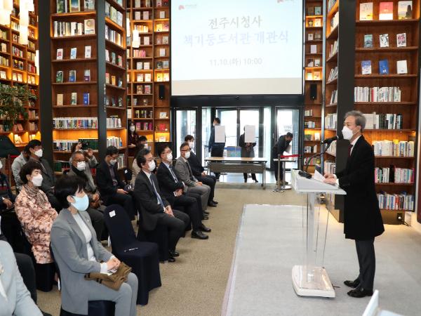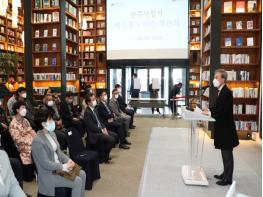 전주시는 10일 시청 로비에서 김승수 전주시장과 김수영 한국출판문화산업진흥원장 등이 참석한 가운데 ‘전주시청 책기둥도서관’ 개관식을 개최했다.