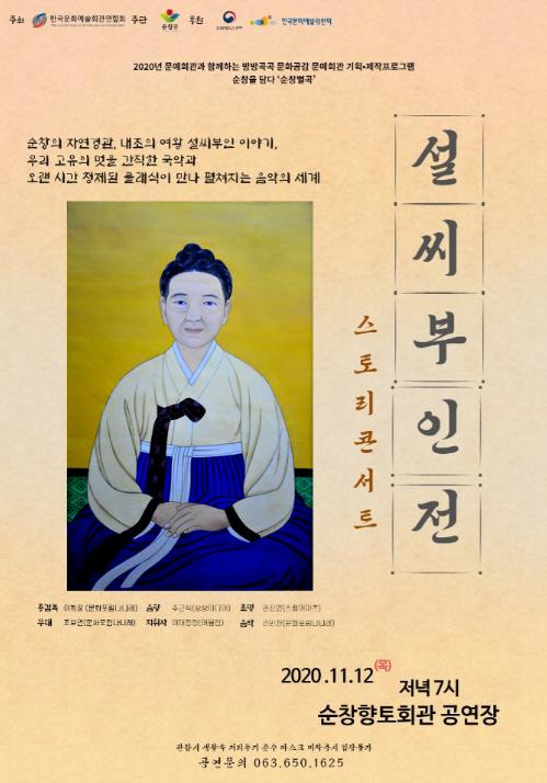 순창군이 오는 12일 저녁 7시 순창향토회관에서 코로나19로 중단된 문화공연에 활기를 불어 넣기 위해 ‘스토리 콘서트 - 설씨부인전’공연을 준비했다. 이번 공연은 무료로 진행되며, 관람객은 선착순으로 입장할 예정이다. 또 관람객들은 코로나19 확산방지를 위해 마스크 미착용시 입장이 불가하다.