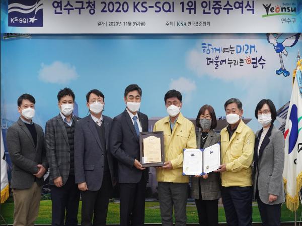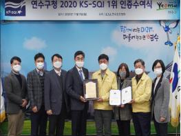 인천 연수구가 한국표준협회 주관 ‘2020년 한국서비스 품질지수조사(KS-SQI)’ 행정서비스 분야에서 인천지역 기초단체 중 1위를 차지해 기관 인증패를 전달 받았다.