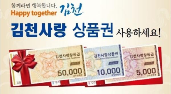 한편, 시는 연말까지 김천사랑상품권 10% 특별할인을 실시한다. 특별할인 기간 동안 김천사랑상품권·김천사랑카드를 구매하면 월 최대 7만원의 할인혜택을 받을 수 있으며, 김천사랑상품권 및 카드는 관내 44개 금융기관(농·축협, 대구은행, 신협, 새마을금고 등)에서 구매할 수 있다.