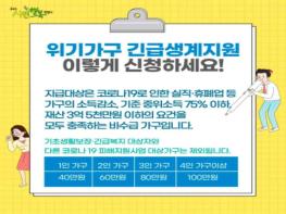 저소득 위기가구를 대상으로 신청 가능한 ‘위기가구 긴급 생계지원’ 사업은 코로나19로 인한 실직·휴폐업 등 가구의 소득이 감소된 가구, 기준 중위소득 75% 이하, 재산 3억 5천만원 이하의 요건을 모두 충족하는 비수급 가구에게 한시적 지원 가능한 사업이다.