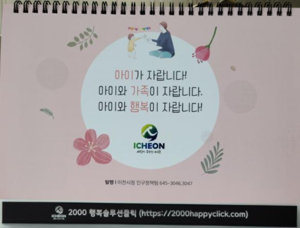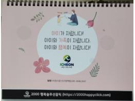 이천시는 ‘아이와 가족이 자랍니다’‘아이와 행복이 자랍니다’라는 주제로 2021년 육아정보 탁상용 달력을 제작해 주민이 자주 방문하는 어린이도서관, 아이랑카페, 문화센터 등 기관에 배부한다고 밝혔다.