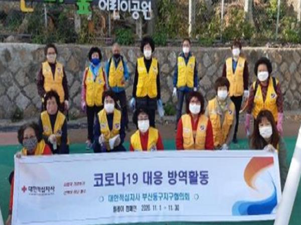 대한적십자사 부산동구지구협의회는 좌천동 증산공원으로 집결하여 코로나19대응 일환으로 공원 일대에 대한 방역활동을 실시했다.