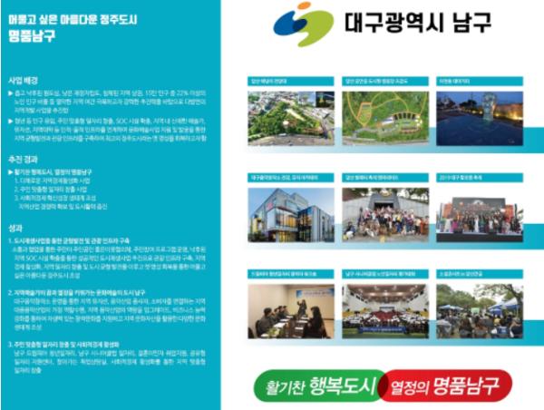 박람회의 시군구 균형발전 우수사례가 전시되는 지역균형뉴딜 전시관에서 대구 남구는 앞산 해넘이전망대 및 앞산 골안골 도시형 캠핑장 조성 사업을 통한 관광 인프라 구축, 도시재생을 통한 균형발전 및 지역경제활성화 추진, 지역예술가의 꿈과 열정을 키워가는 문화예술의 도시, 주민맞춤형 일자리 창출 및 사회적경제 활성화 등의 우수사례를 소개한다.