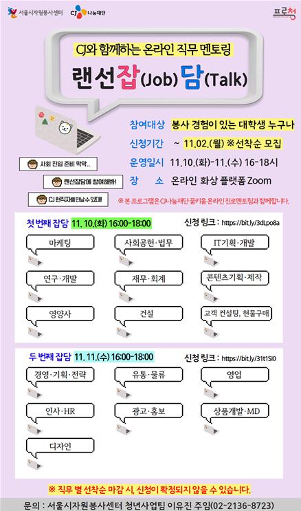 서울시자원봉사센터는, 10일-11일 양일간 CJ그룹과 함께, 사회 진입을 준비하며 진로에 대해 고민이 많은 청년을 위한 온라인 직무 멘토링 ‘랜선잡(Job)담(Talk)’을 운영한다.
