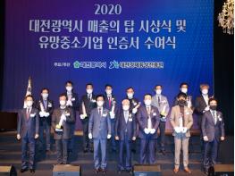 대전시는 이날 매출의 탑 시상식에서 2019년 혁신성장과 판로개척으로 매출액 기준 100억 원 이상을 돌파해 지역경제 활성화에 기여한 18개 기업과 성장잠재력이 있는 지역의 50개 기업에게 유망 중소기업 인증서를 수여했다.