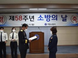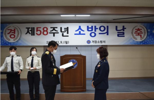 거창소방서장은 “제58회 소방의 날을 맞아 평소 각종재난현장과 소방행정발전에 솔선수범하여 모범이 되는 분들에게 표창을 수여 할 수 있어 기쁘다”며, “앞으로도 군민의 생명 보호와 재산피해를 막는데 노력해 주길 바란다”며 격려했다.