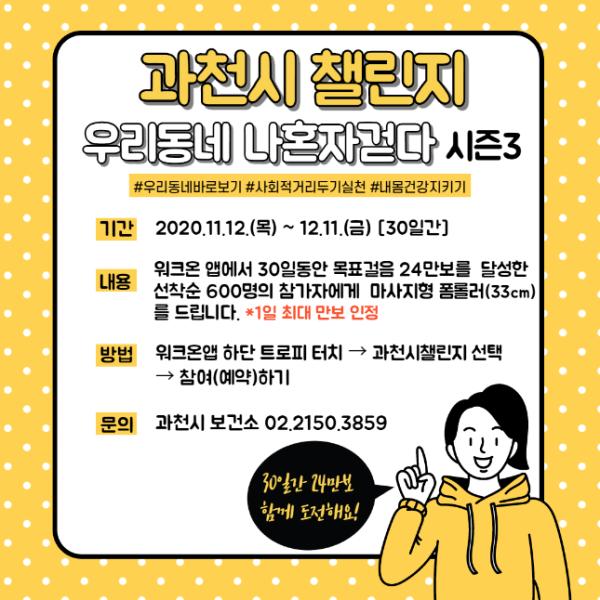 과천시 보건소는 코로나19 확산으로 위축된 과천 시민의 일상 속 걷기 실천을 장려하기 위해 모바일 걷기앱 워크온을 통한 ‘우리동네 나혼자 걷다’ 11월 챌린지를 오는 12일부터 30일간 운영한다고 10일 밝혔다.