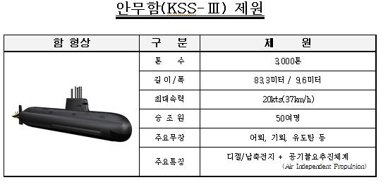 안무함은 3,000톤급 규모로, 길이 83.3미터, 폭 9.6미터에 수중 최대속력은 20kts(37km/h) 이상, 탑승 인원은 50여 명으로 1번함인 도산안창호함과 동급의 함정이다. 안무함은 장보고-Ⅱ급 잠수함 대비 2배 정도 커졌고, 수중 잠항기간도 늘어났다. 더불어 안무함은 초기 설계 단계부터 민·관·군 협력으로 잠수함의 두뇌 역할을 하는 핵심장비인 전투·소나 체계를 비롯해 다수의 국내 개발 장비 등을 탑재하여, 전체 국산화 비율을 향상시켰다.