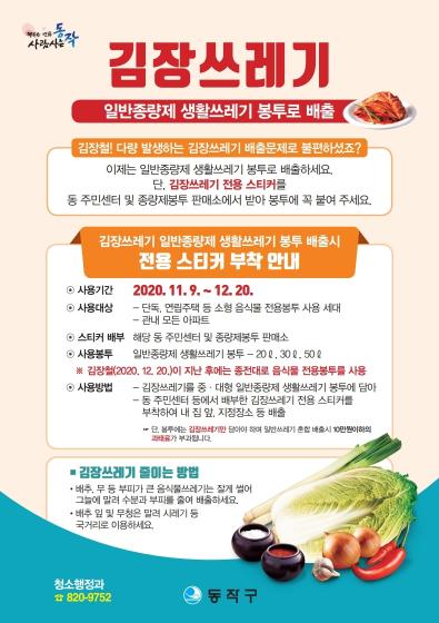 동작구가 김장철을 맞이하여 내달 20일까지 ‘김장철 음식물쓰레기 처리 대책’을 추진한다고 밝혔다.