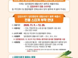 해당 기간에는 배추, 무 등 김장 잔류물 배출 시 ‘김장쓰레기 전용스티커’를 부착한 중형 일반종량제 봉투(20ℓ, 30ℓ, 50ℓ)를 사용할 수 있으며, 기간 이후에는 종전대로 음식물전용봉투를 사용해야 한다.