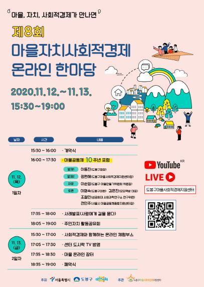 한마당 행사는 12일과 13일 양일간 오후 3시 30분부터 7시까지 마을사회적경제센터 공식 유튜브 채널을 통해 실시간 방영 될 예정이다.