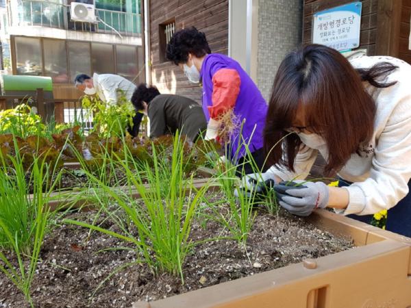 집안에서 지내는 시간이 길어 몸과 마음이 지쳐있는 어르신들을 위해 경로당 외부에 조성한 텃밭을 활용해 생활원예치유 프로그램도 운영하고 있다.