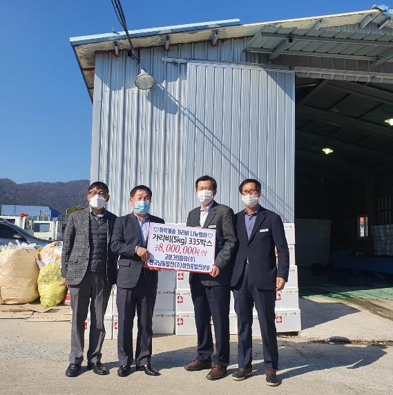 한국남동발전 삼천포발전본부(본부장 임다두)와 고성그린파워(주)(대표이사 임진규)는 11월 10일 고성군을 방문하여 코로나19로 인해 외부활동이 어려운 지역 어르신들을 위해 제4회 온라인 고성 가리비 수산물축제에서 판매하는 가리비 335박스(1.7톤, 800만 원 상당)를 구입하여 관내 취약계층에 기탁했다.