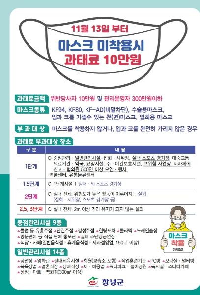 창녕군은 코로나19 감염증 대응과 확산 차단을 위해 마스크 착용 의무화 행정명령을 12일까지 계도기간을 거쳐 오는 13일부터 본격 점검 및 단속에 들어간다.
