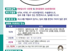 과태료 부과대상은 마스크를 착용하지 않거나 올바르게 착용하지 않았을 경우로 망사형마스크, 밸브형마스크, 스카프 등 옷가지로 얼굴을 가리는 것은 허용하지 않으며 위반 당사자에게는 10만원 이하, 관리운영자는 방역지침의무 미준수 시 300만원 이하의 과태료가 부과될 수 있다.
