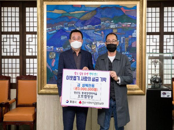 통영시 한산면 소재 '한산도 통제영테마마을 오토캠핑장(대표 최장권)'은 11월 9일 통영시를 방문해 이웃사랑 나눔성금 300만원을 기탁했다.