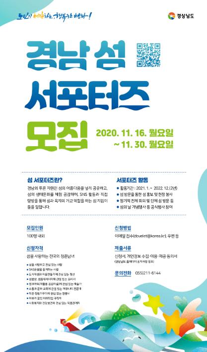 경상남도는 오는 16일부터 30일까지 2주간 섬 공동체와 소통하고 홍보를 통해 섬과 육지를 잇는 가교 역할을 할 ‘섬 서포터즈’를 공개 모집한다고 밝혔다. 섬을 정말 아끼고 사랑하는 전국의 섬 매니아들을 연령, 지역 제한 없이 100명 내외로 뽑는다.