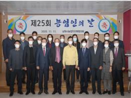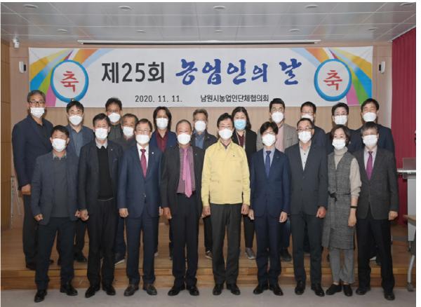 남원시는 매년 11월 11일 성대하게 추진됐던 농업인 날 행사를 코로나19에 따른 사회적 거리두기로 농업인대상 시상식만 간소하게 진행했다. 농업인상생플랫폼에서 열린 제25회 농업인의 날 시상식은 농림시책에 적극 호응하고 소득증대 및 농업?농촌 발전에 헌신적으로 노력한 우수농업인으로 해당 분야에 공적 있는 자를 시상하기 위해 열렸다.