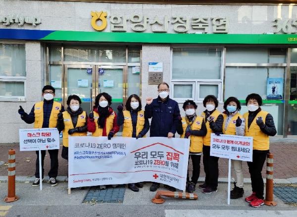 함양군 안의면적십자봉사회(회장 박희숙)는 11일 오전 축협사거리 일원에서 ‘코로나19 ZERO 캠페인’을 펼쳤다.