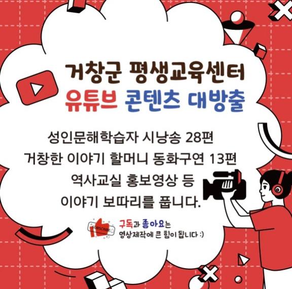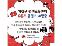 이번에 선보일 콘텐츠는 거창한 이야기 할머니의 금도끼 은도끼 등 동화구연 13편과 성인문해학습자 시낭송 28편, 가족과 함께하는 교과서속 역사교실 홍보영상 등이다.