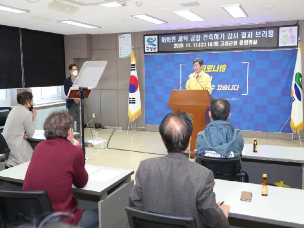 백두현 고성군수는 11월 11일 오후 2시 30분 고성군청 중회의실에서 ‘회화면 세탁 공장 건축허가 감사 결과’를 발표하며 코로나 정국, 즉 비상시기에 해이해진 공직기강 확립을 재차 강조했다.