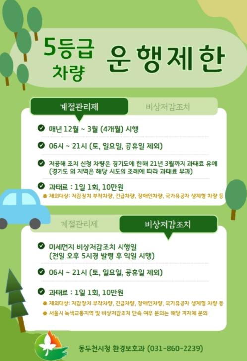 미세먼지 계절관리제는 매년 동절기(12월 1일~3월 31일)에 배출가스 5등급 차량을 제한대상으로 수도권 전역에서 시행되며, 적발 시 1회 10만원의 과태료가 부과된다. 배출가스 저감장치를 부착하였거나, 긴급, 장애, 유공자, SOFA, 특수 차량 등은 대상에서 제외된다.