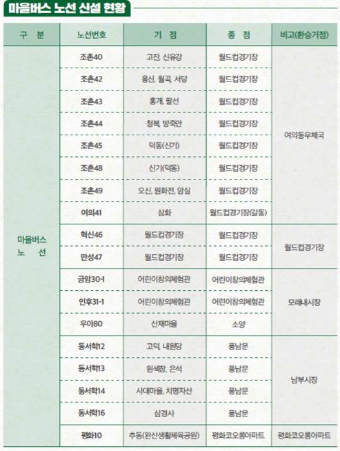 마을버스는 오는 14일부터 △고잔·신유강·덕동·홍개·청복·용신·신기·오신마을 등 조촌·여의동 노선(8개) △혁신·만성동 노선(2개 노선) △산재·금하·원산정마을 등 우아2·금암2·인후2동 노선(3개) △삼경사·고덕·내원당마을 등 동서학동 노선(4개) △추동·학전·원당리 등 평화2동 노선(1개) 등 총 18개 노선에서 운행된다. 운행 노선 및 시간표 등은 전주시 홈페이지와 승강장에 부착된 포스터 등에서 확인할 수 있다.