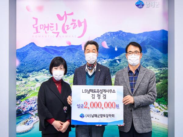 같은 날, 김정겸 LS토목설계사무소 대표도 군수실을 찾아 장학금 200만원을 기탁하였다. LS토목설계사무소는 토목설계 및 산지전용, 농지전용, 건축관리, 측량업을 하는 업체로 남해읍에 소재하고 있다.