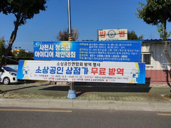 사천시소상공인연합회는 지난 11일 사천여고 사거리와 사천읍행정복지센터 인근에 사천읍지역 소상점가를 대상으로 하는 무료방역 접수 현수막을 게시하고 신청이 들어오는 대로 업체를 방문해 방역활동을 시행할 예정임을 밝혔다.
