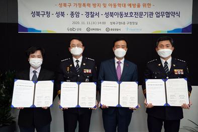 11일 이승로 성북구청장과 최성규 성북경찰서장, 박규남 종암경찰서장, 김병익 성북아동보호전문기관장은 성북구청장실에 모여 『위기가정통합지원 및 아동학대예방 업무협약』에 서명했다.