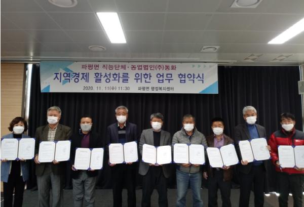 파주시 파평면은 지난 11일, 이호규 전 파평면 주민자치위원장(현 주민자치회 위원)을 비롯한 파평면 단체장들과 농업법인 ㈜동화(대표 장동문) 등이 참석한 가운데 파평면 지역경제 활성화를 위한 업무 협약식을 가졌다.