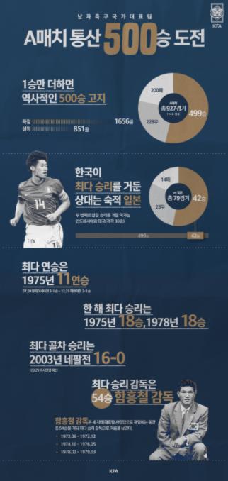 현재 대표팀은 A매치 통산 500승을 목전에 두고 있다. 대표팀은 1948년 출범 이후 지금까지 총 927회의 A매치를 치러 499승 228무 200패(득점 1656골, 실점 851골)를 기록 중이다. 이제 1승만 더하면 역사적인 500승 고지에 올라서게 된다. KFA는 500승 도전을 앞두고 A매치 승리와 관련한 기록을 정리해봤다.