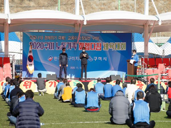 구미시는 11. 12(목) 11:00 구포생활체육공원에서 노사민정 관계자 등 350명이 참석한 가운데 한국노총경북본부구미지역지부(의장 김동의) 주관으로 “2020 구미 노동가족 화합다짐 체육대회”를 개최하였다.