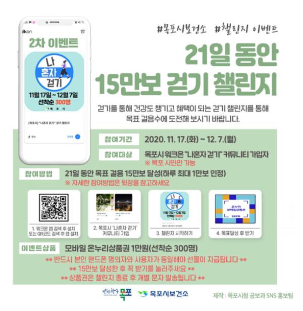 목포시보건소에서는 코로나19 장기화로 인해 신체활동이 부족한 시민의 건강증진을 위해 비대면 건강프로그램‘나혼자 걷기’챌린지 2회차를 진행한다.