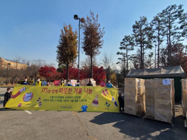 ㈔한국제이티에스는 12일 오후 1시 팔달구 수원시월드컵경기장 제4주차장에서 수원시자원봉사센터에 소외계층 아동을 위한 후원 물품을 전달했다.
