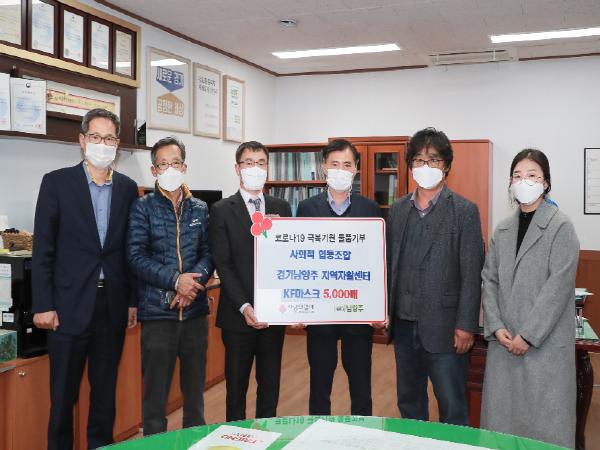 사회적협동조합 경기남양주지역자활센터(이사장 박영춘)는 지난 11일 코로나19 확산 방지와 지역사회의 안전을 위하여 KF94 마스크 5,000매를 경기사회복지공동모금회에 전달했다.