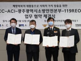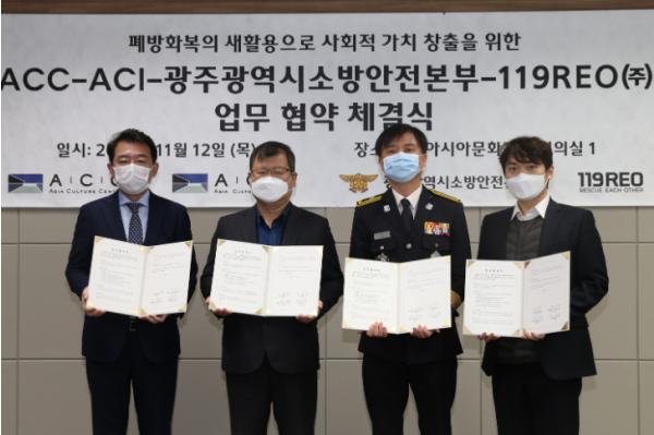 광주광역시 소방안전본부는 12일 국립아시아문화전당에서 폐방화복을 재활용해 새 상품으로 제작하는 119REO㈜와 국립아시아문화전당, 아시아문화원과 폐방화복 활용 관련 업무협약을 체결했다.